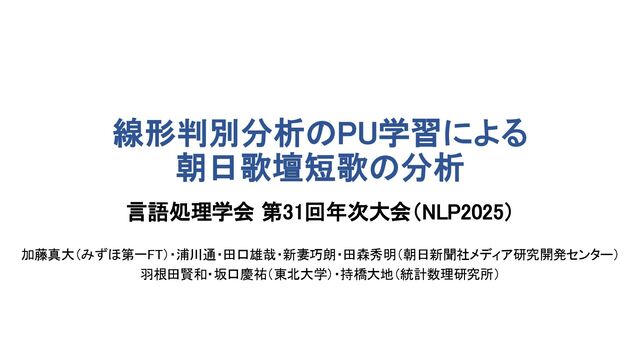 positive and unlabeled data,” in International Conference on Knowledge Discovery and Data Mining. Association for Computing Machinery, 2008, p. 213–220. • S. Arora, Y. Liang, and T. Ma, “A simple but tough-to-beat baseline for sentence embeddings,” in International Conference on Learning Representations (ICLR), 2017. • Fisher, R. A.: The Use of Multiple Measurements in Taxonomic Problems, Annals of Eugenics, Vol. 7, No. 2, pp. 179–188 (1936). • 羽根田賢和,浦川通,田口雄哉,田森秀明,坂口慶祐,“RLHF を用いた「面白い」短歌の自動生成の試 み”,言語処理学会第30 回年次大会論文集,2024. • 新妻巧朗,田口雄哉,田森秀明: 計量テキスト分析のた めの文埋め込みによる探索的カテゴリ化,言語処 理学会 第 30 回年次大会,pp. 494–499 (2024). 20