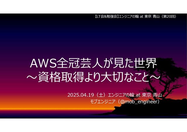 2025.04.19(土)に参加した「【LT会&勉強会】エンジニアの輪 at 東京 青山(第20回)」の登壇資料です。 connpass:https://circle-of-engineer.connpass.com/event/348590/