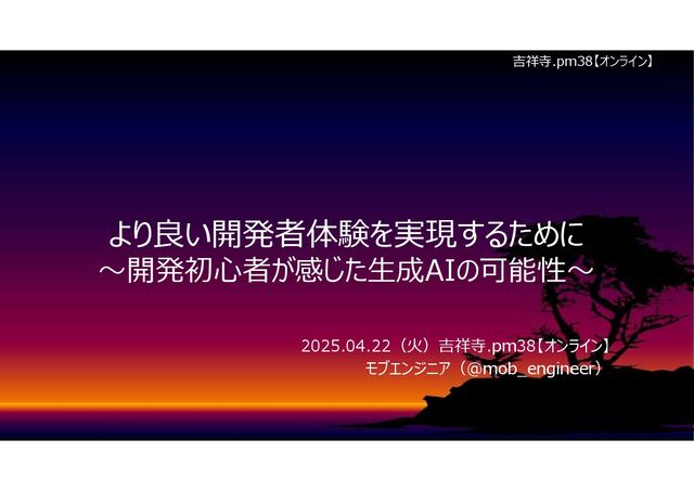 より良い開発者体験を実現するために ~開発初心者が感じた生成AIの可能性~ 2025.04.22(火)吉祥寺.pm38【オンライン】 モブエンジニア(@mob_engineer) 吉祥寺.pm38【オンライン】