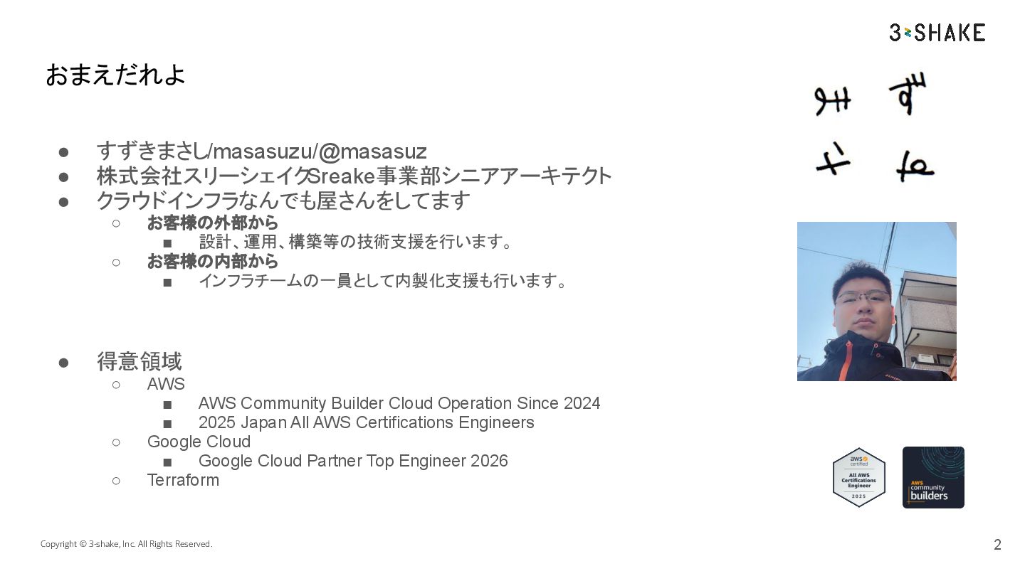 すずきまさし/masasuzu/@masasuz • 株式会社スリーシェイクSreake事業部シニアアーキテクト • クラウドインフラなんでも屋さんをしてます ◦ お客様の外部から ▪ 設計、運用、構築等の技術支援を行います。 ◦ お客様の内部から ▪ インフラチームの一員として内製化支援も行います。 • 得意領域 ◦ AWS ▪ AWS Community Builder Cloud Operation Since 2024 ▪ 2025 Japan All AWS Certifications Engineers ◦ Google Cloud ▪ Google Cloud Partner Top Engineer 2026 ◦ Terraform