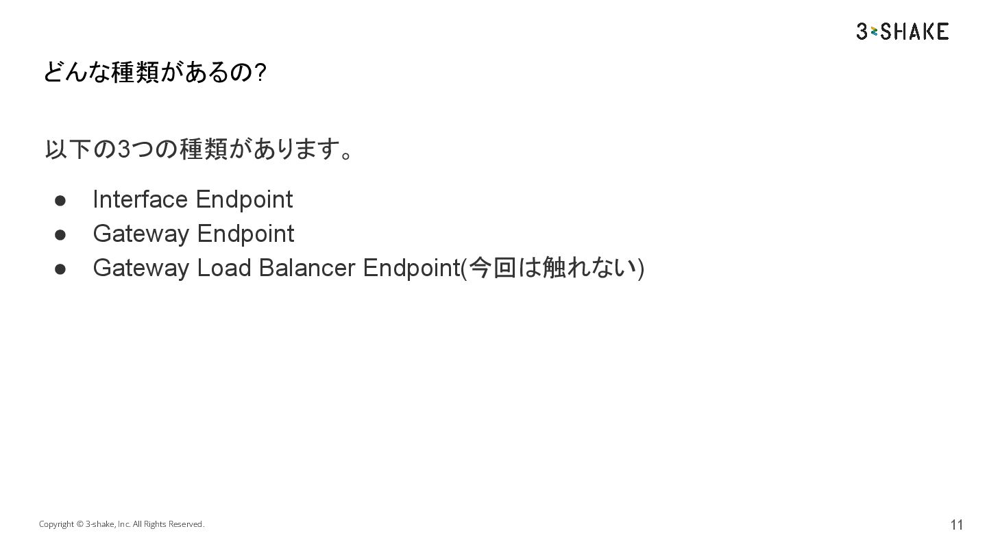 Balancer Endpoint(今回は触れない) Copyright © 3-shake, Inc. All Rights Reserved. どんな種類があるの? 11