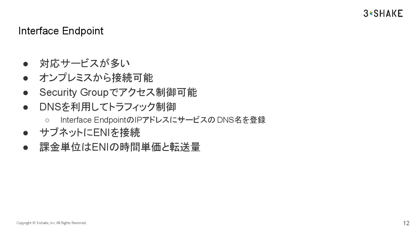 Interface EndpointのIPアドレスにサービスの DNS名を登録 • サブネットにENIを接続 • 課金単位はENIの時間単価と転送量 Copyright © 3-shake, Inc. All Rights Reserved. Interface Endpoint 12