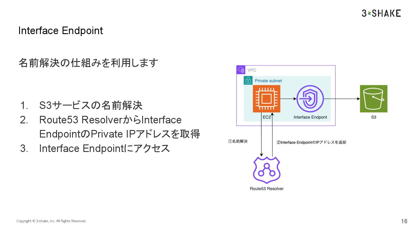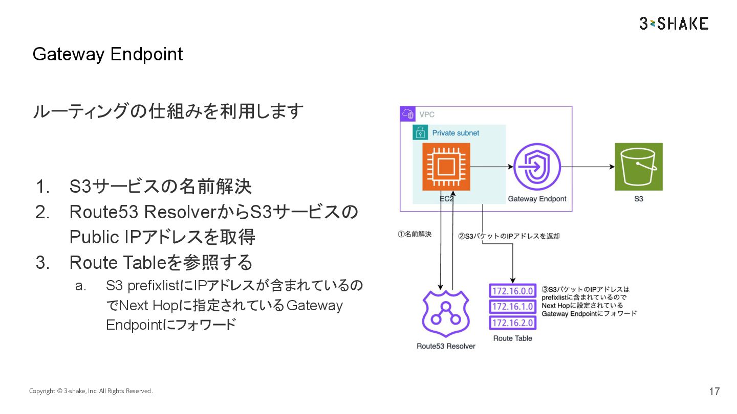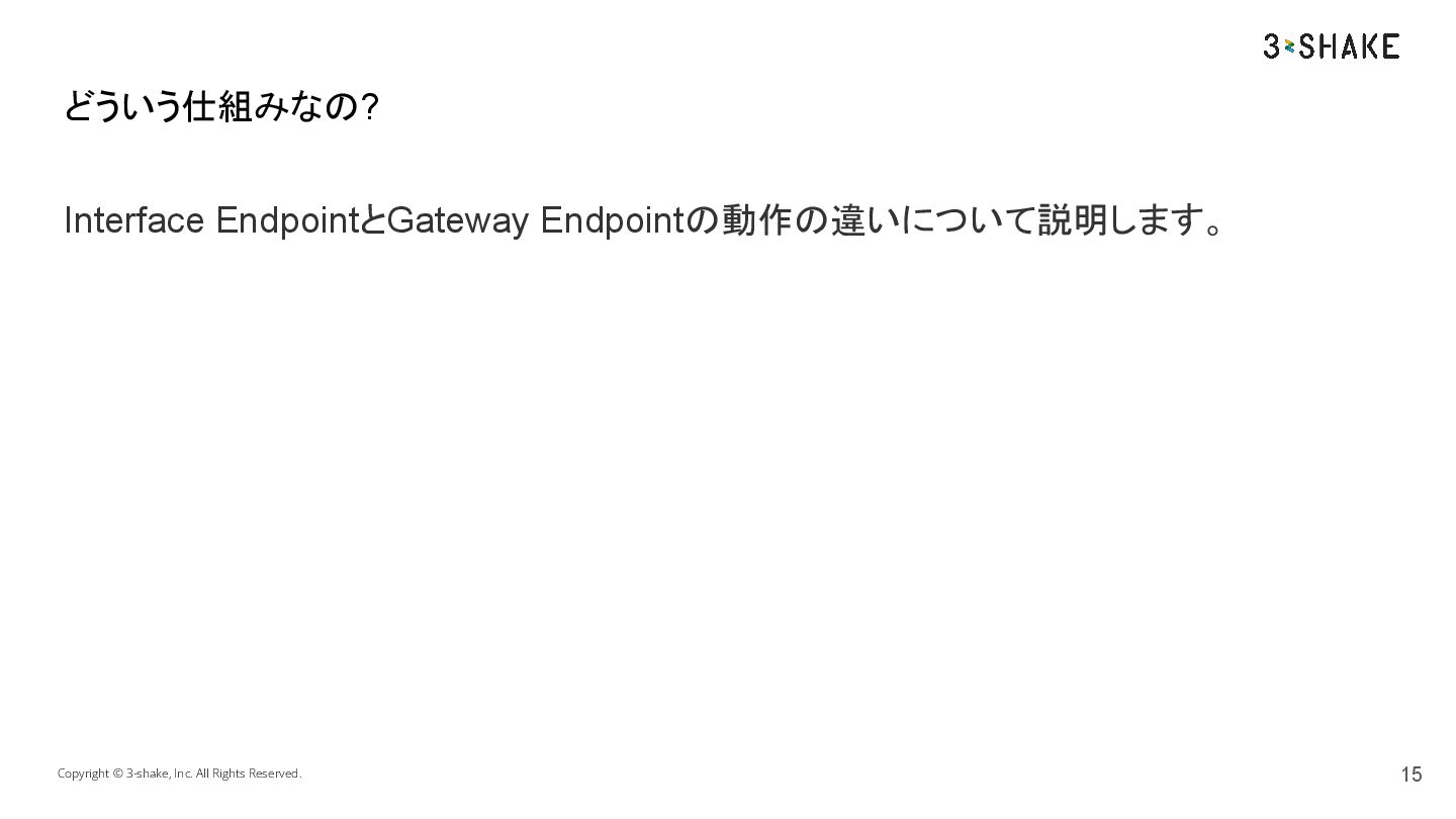 Interface EndpointとGateway Endpointの動作の違いについて説明します。 Copyright © 3-shake, Inc. All Rights Reserved.