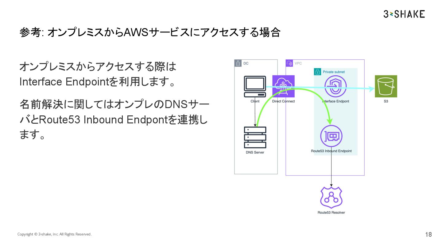 3-shake, Inc. All Rights Reserved. 参考: オンプレミスからAWSサービスにアクセスする場合 18