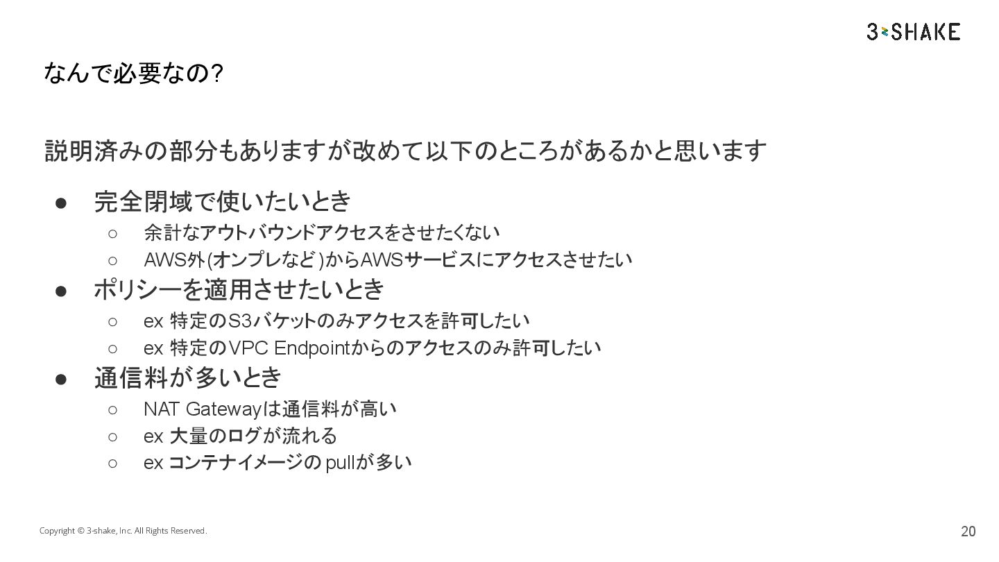 ex 特定のS3バケットのみアクセスを許可したい ◦ ex 特定のVPC Endpointからのアクセスのみ許可したい • 通信料が多いとき ◦ NAT Gatewayは通信料が高い ◦ ex 大量のログが流れる ◦ ex コンテナイメージのpullが多い Copyright © 3-shake, Inc. All Rights Reserved. なんで必要なの? 20