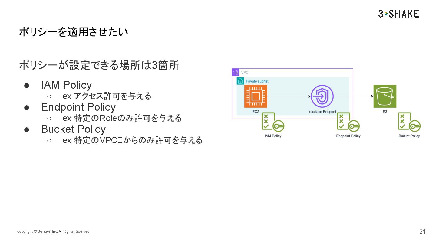 ◦ ex 特定のRoleのみ許可を与える • Bucket Policy ◦ ex 特定のVPCEからのみ許可を与える Copyright © 3-shake, Inc. All Rights Reserved. ポリシーを適用させたい 21
