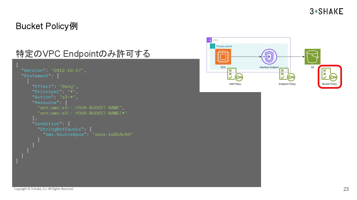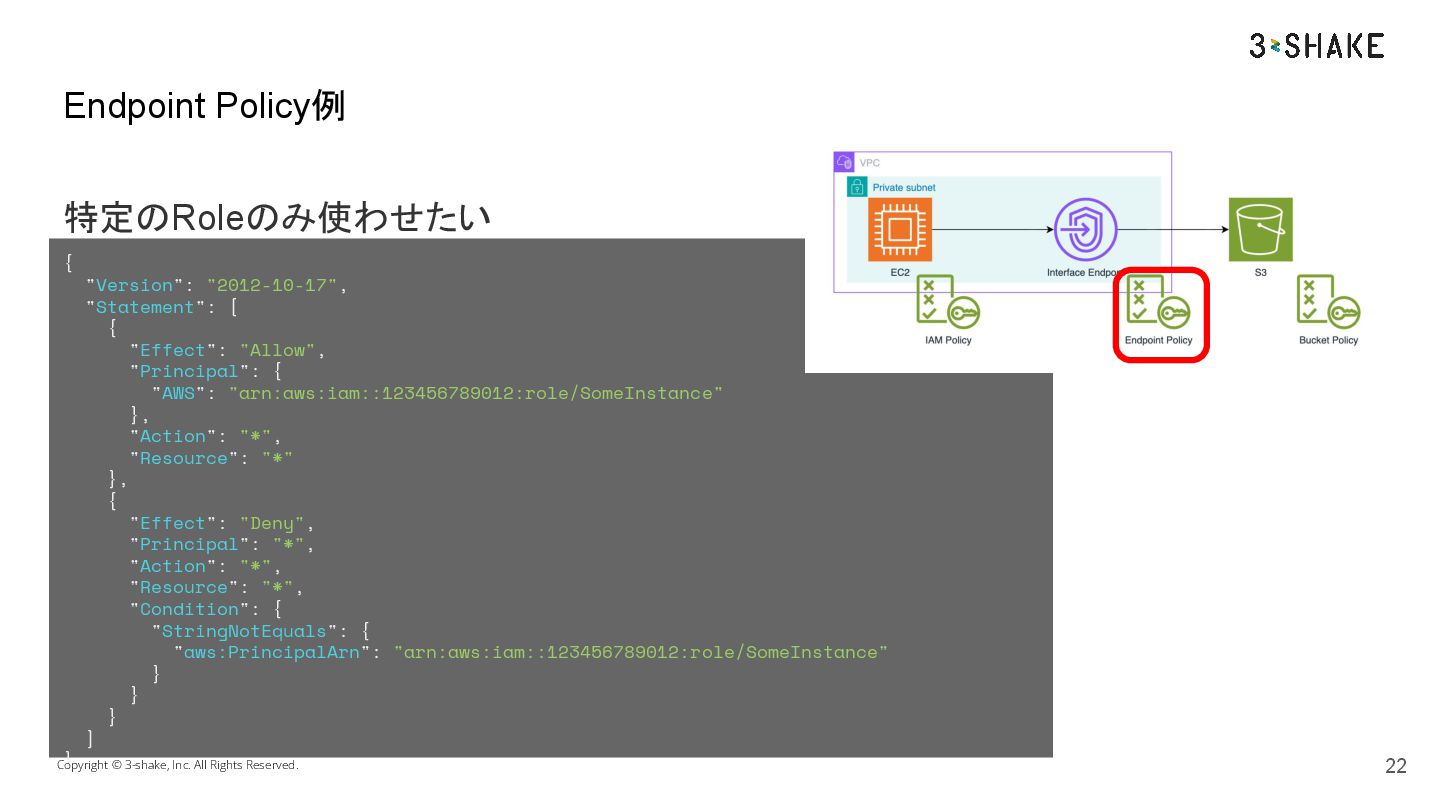 "AWS": "arn:aws:iam::123456789012:role/SomeInstance" }, "Action": "*", "Resource": "*" }, { "Effect": "Deny", "Principal": "*", "Action": "*", "Resource": "*", "Condition": { "StringNotEquals": { "aws:PrincipalArn": "arn:aws:iam::123456789012:role/SomeInstance" } } } ] } Copyright © 3-shake, Inc. All Rights Reserved. Endpoint Policy例 22 特定のRoleのみ使わせたい