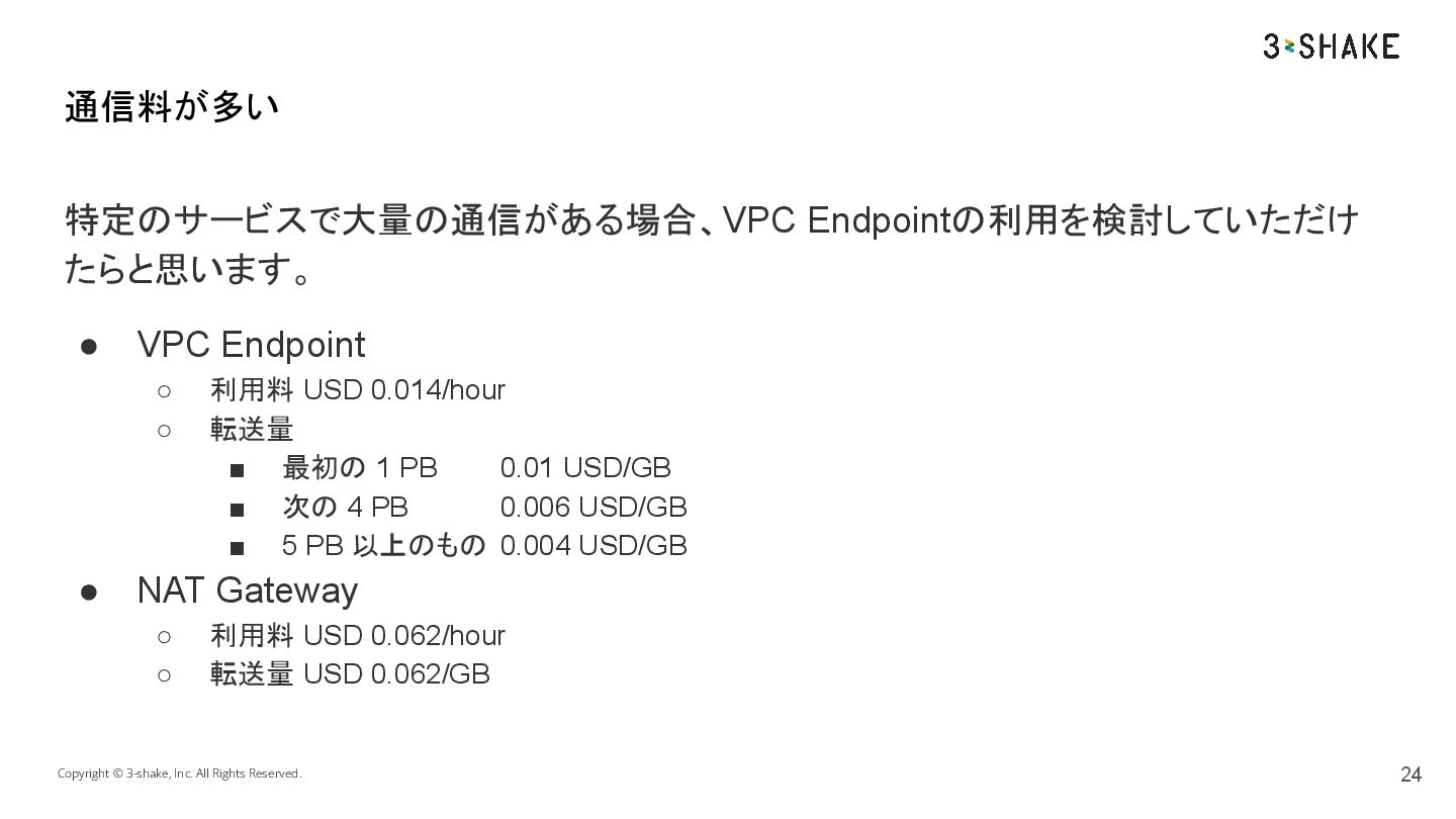 ◦ 転送量 ▪ 最初の 1 PB 0.01 USD/GB ▪ 次の 4 PB 0.006 USD/GB ▪ 5 PB 以上のもの 0.004 USD/GB • NAT Gateway ◦ 利用料 USD 0.062/hour ◦ 転送量 USD 0.062/GB Copyright © 3-shake, Inc. All Rights Reserved. 通信料が多い 24