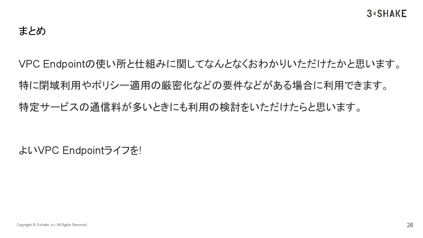 VPC Endpointの使い所と仕組みに関してなんとなくおわかりいただけたかと思います。 特に閉域利用やポリシー適用の厳密化などの要件などがある場合に利用できます。 特定サービスの通信料が多いときにも利用の検討をいただけたらと思います。 よいVPC Endpointライフを! Copyright © 3-shake, Inc.