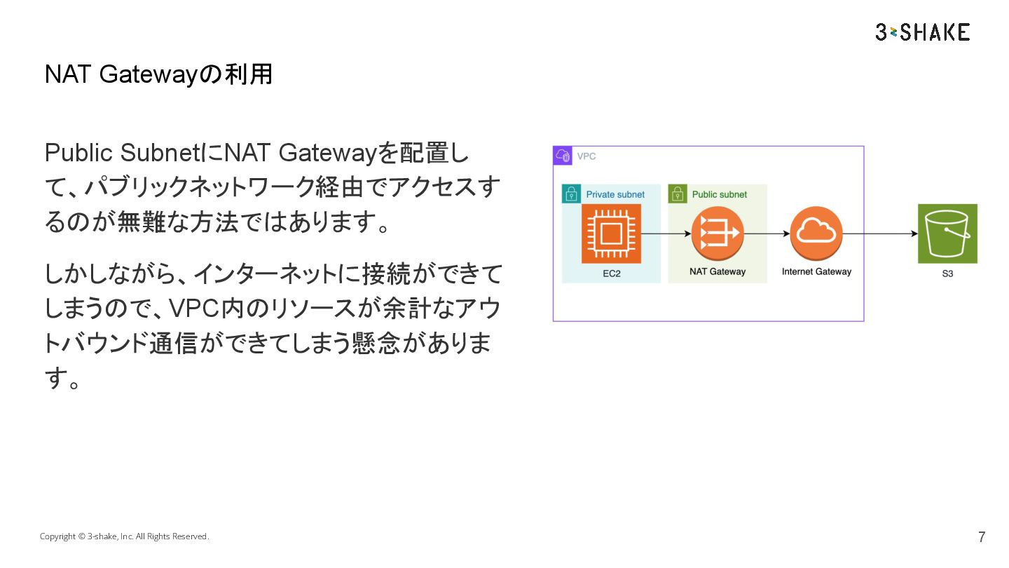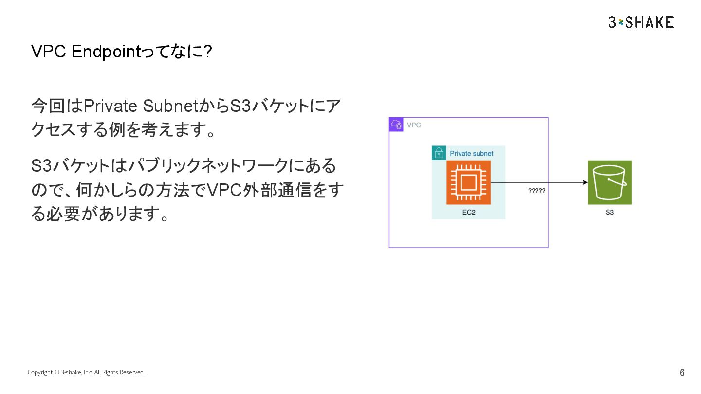 今回はPrivate SubnetからS3バケットにア クセスする例を考えます。 S3バケットはパブリックネットワークにある ので、何かしらの方法でVPC外部通信をす る必要があります。 Copyright © 3-shake, Inc.