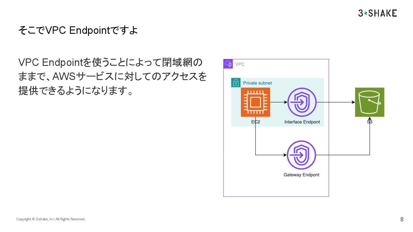 VPC Endpointを使うことによって閉域網の ままで、AWSサービスに対してのアクセスを 提供できるようになります。 Copyright © 3-shake, Inc. All Rights