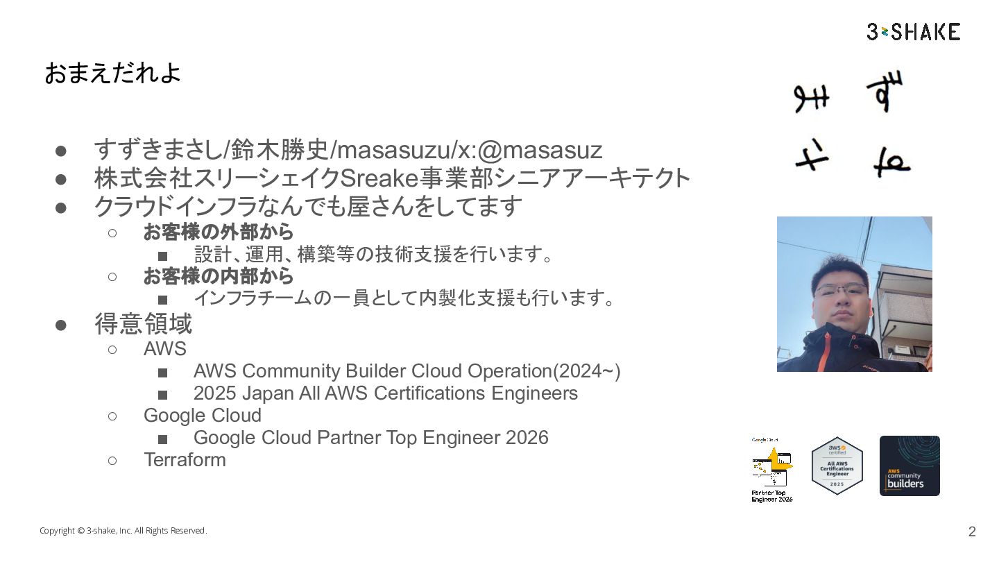 すずきまさし/鈴木勝史/masasuzu/x:@masasuz • 株式会社スリーシェイクSreake事業部シニアアーキテクト • クラウドインフラなんでも屋さんをしてます ◦ お客様の外部から ▪ 設計、運用、構築等の技術支援を行います。 ◦ お客様の内部から ▪ インフラチームの一員として内製化支援も行います。 • 得意領域 ◦ AWS ▪ AWS Community Builder Cloud Operation(2024~) ▪ 2025 Japan All AWS Certifications Engineers ◦ Google Cloud ▪ Google Cloud Partner Top Engineer 2026 ◦ Terraform