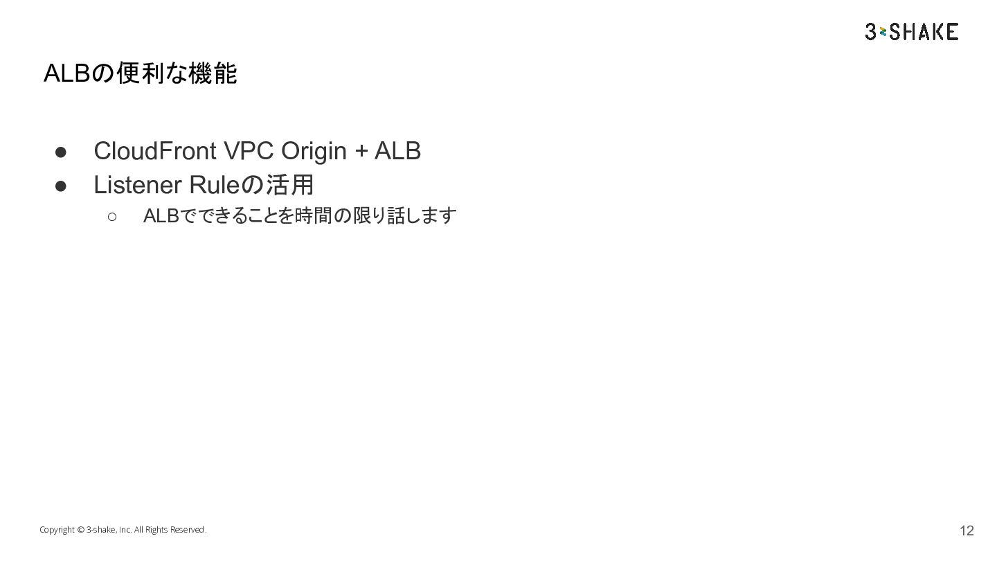 ALBでできることを時間の限り話します Copyright © 3-shake, Inc. All Rights Reserved. ALBの便利な機能 12