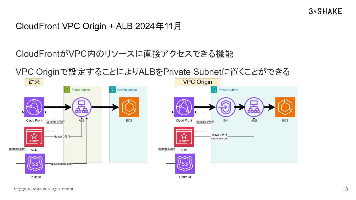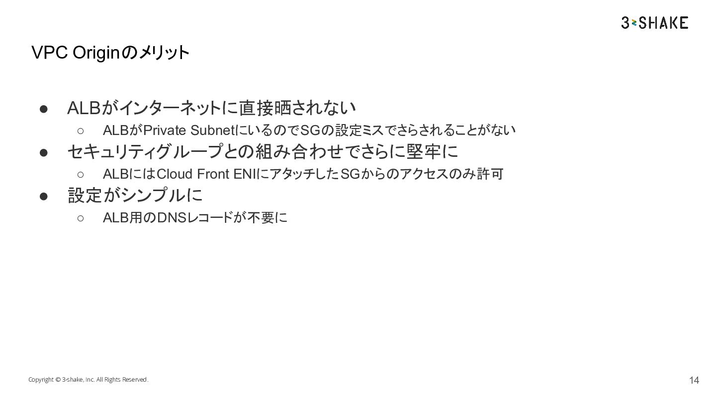 CloudFrontがVPC内のリソースに直接アクセスできる機能 VPC Originで設定することによりALBをPrivate Subnetに置くことができる Copyright © 3-shake, Inc. All Rights
