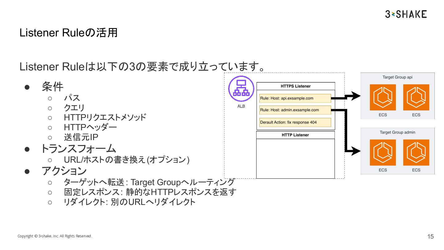 ◦ HTTPヘッダー ◦ 送信元IP • トランスフォーム ◦ URL/ホストの書き換え(オプション) • アクション ◦ ターゲットへ転送: Target Groupへルーティング ◦ 固定レスポンス: 静的なHTTPレスポンスを返す ◦ リダイレクト: 別のURLへリダイレクト Copyright © 3-shake, Inc. All Rights Reserved. Listener Ruleの活用 15