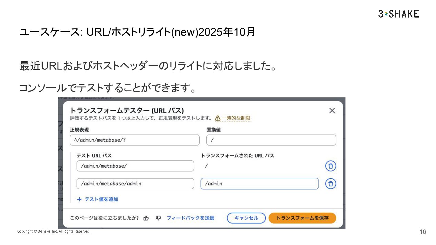 最近URLおよびホストヘッダーのリライトに対応しました。 コンソールでテストすることができます。 Copyright © 3-shake, Inc. All Rights Reserved. ユースケース: