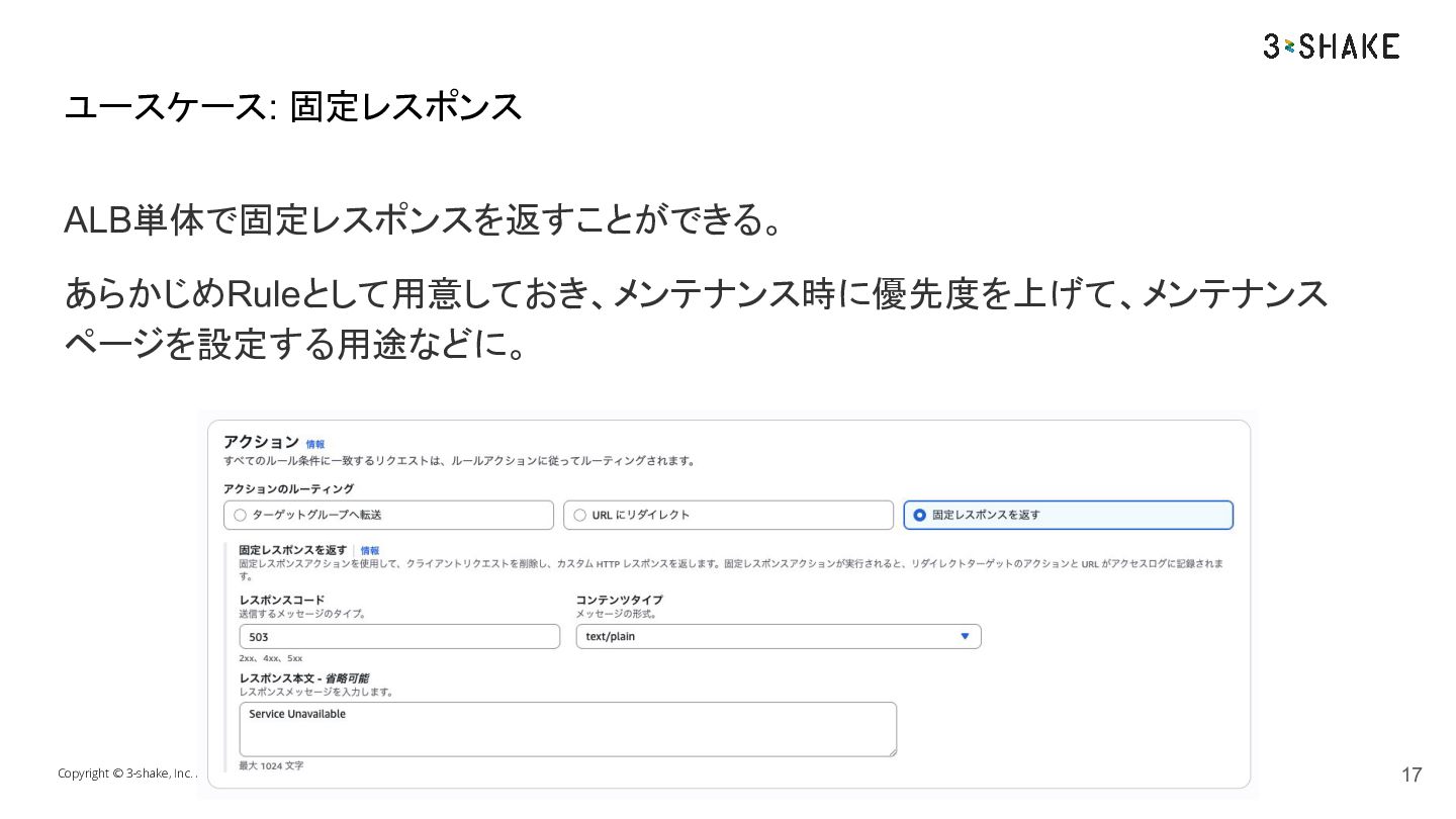 ALB単体で固定レスポンスを返すことができる。 あらかじめRuleとして用意しておき、メンテナンス時に優先度を上げて、メンテナンス ページを設定する用途などに。 Copyright © 3-shake, Inc. All Rights Reserved.