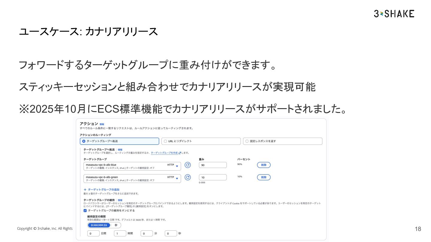 フォワードするターゲットグループに重み付けができます。 スティッキーセッションと組み合わせでカナリアリリースが実現可能 ※2025年10月にECS標準機能でカナリアリリースがサポートされました。 Copyright © 3-shake, Inc. All Rights Reserved.