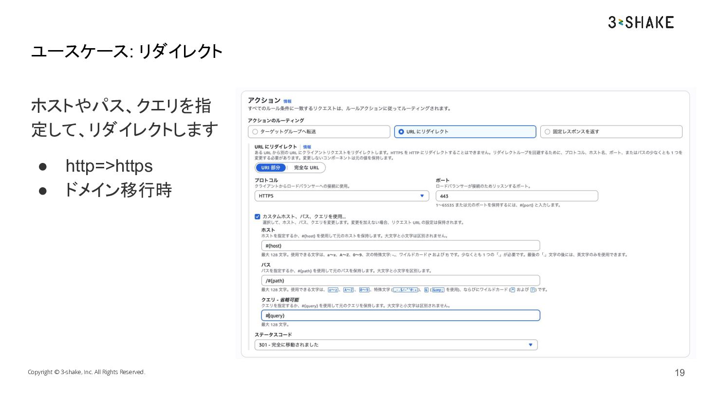 ホストやパス、クエリを指 定して、リダイレクトします • http=>https • ドメイン移行時 Copyright © 3-shake, Inc.