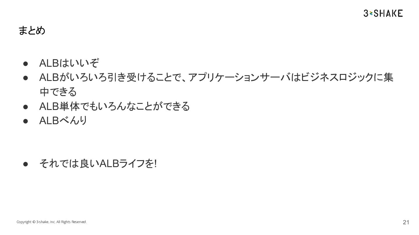 それでは良いALBライフを! Copyright © 3-shake, Inc. All Rights Reserved. まとめ 21