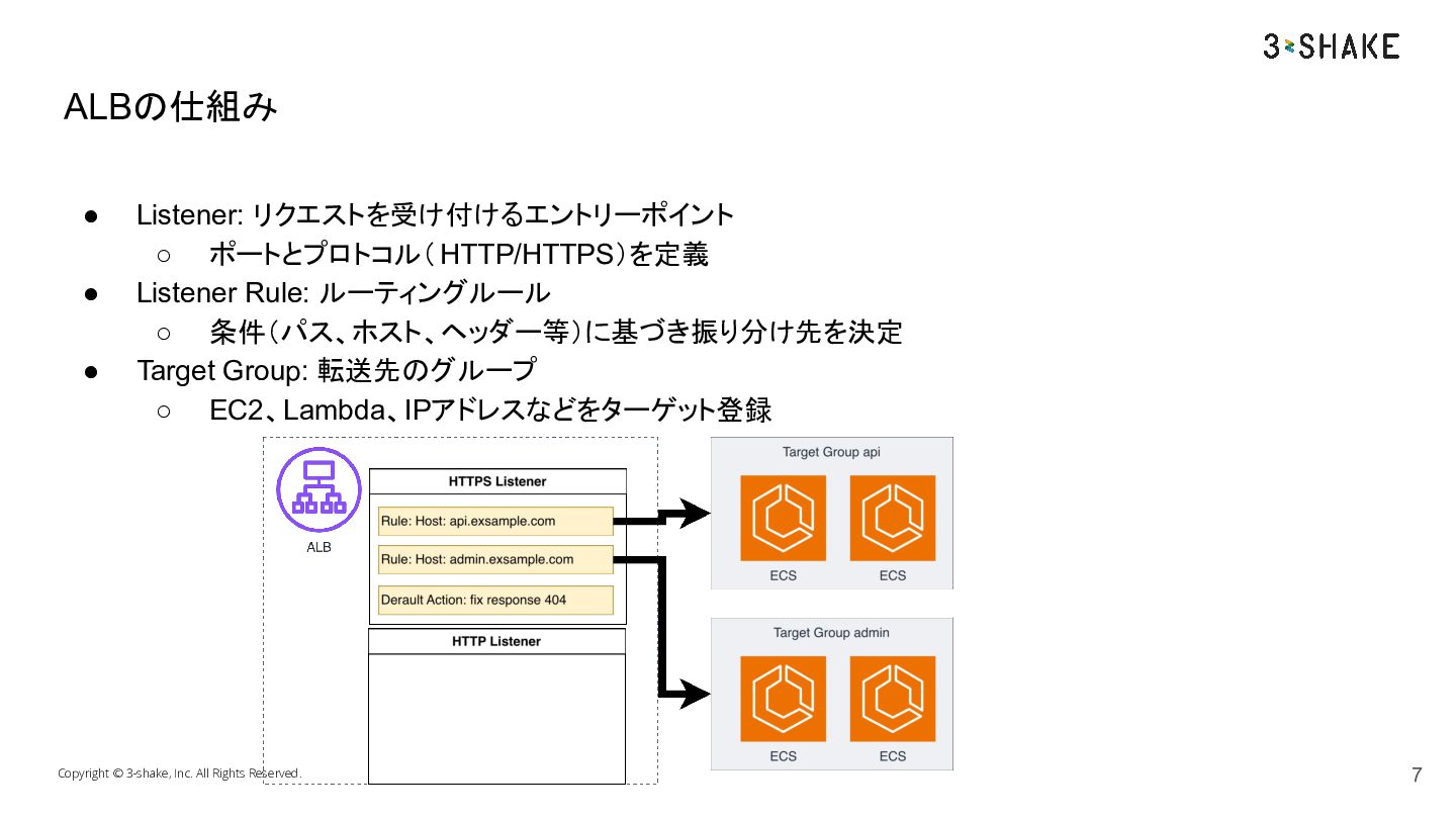 • L7(HTTP/HTTPS)のロードバランサー • アプリケーションサーバのフロントでよしなにしてくれるえらいひと ◦ TLS終端/ターゲット振り分け/ヘッダー判定/認証/リダイレクト Copyright © 3-shake, Inc. All Rights Reserved. ALBとは 5