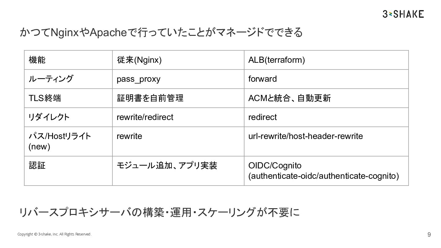 リバースプロキシサーバの構築・運用・スケーリングが不要に Copyright © 3-shake, Inc. All Rights Reserved. かつてNginxやApacheで行っていたことがマネージドでできる 9