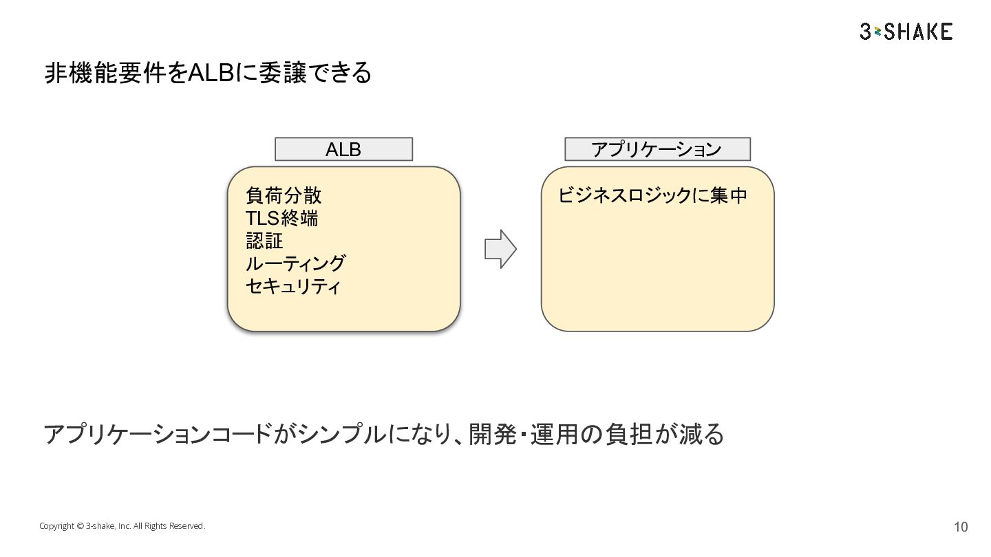 アプリケーションコードがシンプルになり、開発・運用の負担が減る Copyright © 3-shake, Inc. All Rights Reserved. 非機能要件をALBに委譲できる 10