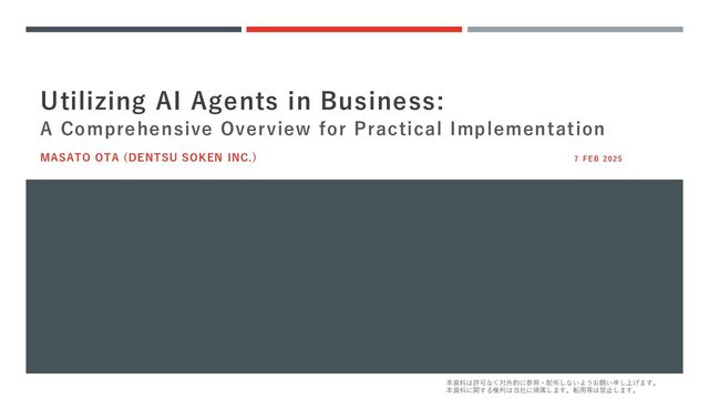 are searching for practical use cases (A defining feature of 2025). Market pressures have fueled the hype and contributed to overpromising. Challenges in Replacing Employees in Japanese Companies • Agent technology is not yet mature for replacing employees. • LLMs lack the high-context understanding required for tasks, needing instructions every time. • Requires organized business documentation, experience reuse, and workflow standardization. Compromises for Practical Implementation • Workflow management and simplifying alternative tasks are essential. • Avoid high-stress tasks and start with single-department operations. Steps Toward Deployment • Focus on quickly analyzing business processes, building agents, and evaluating their limits. • Recognizing current technical boundaries and helping employees adapt to AI is key.