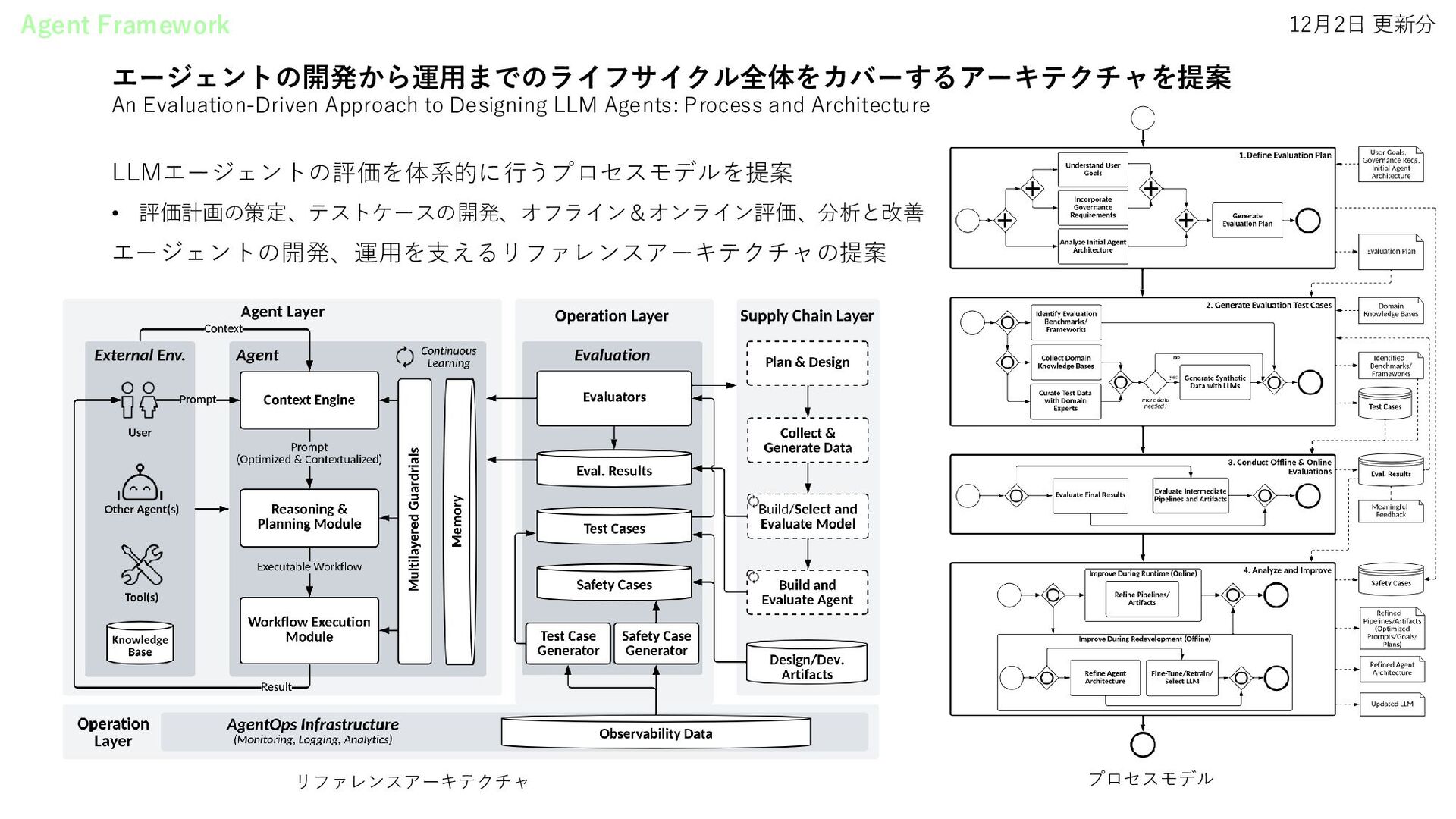 Model based Agents AgentOps: 開発、評価、運用、監視を含むDevOps/MLOpsに似 たプラットフォーム • エージェントは多様なタスクに対応可能だが、意思決定の計画 や挙動の複雑性が課題 • EUのAI法規制に対応するための観測性と追跡性の確保が必要 必要な機能(右図)ごとにドメインモデルもどきを紹介 Agentic AI Systems エージェント登録の例 11月18日 更新分