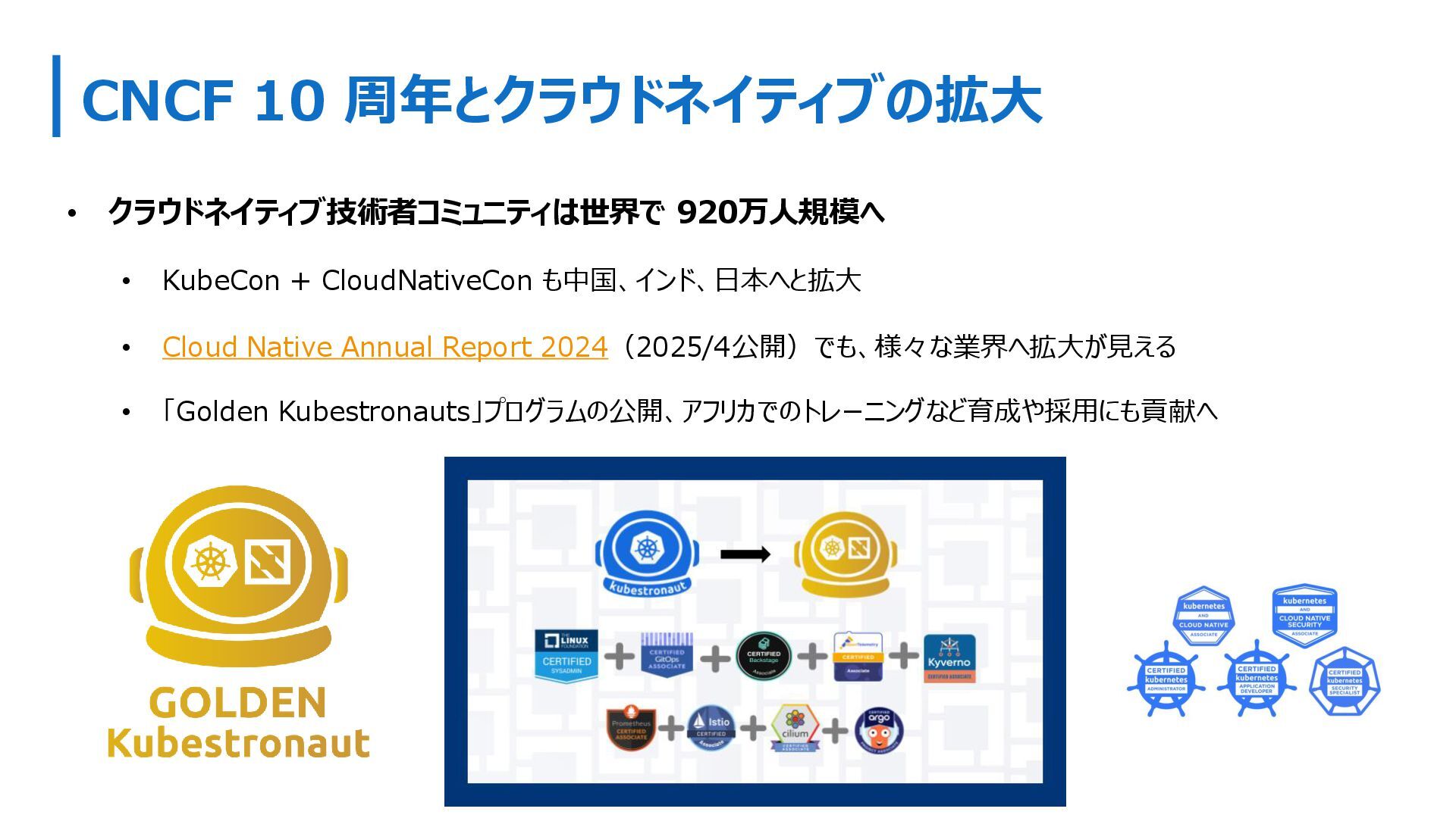 も中国、インド、日本へと拡大 • Cloud Native Annual Report 2024(2025/4公開)でも、様々な業界へ拡大が見える • 「Golden Kubestronauts」プログラムの公開、アフリカでのトレーニングなど育成や採用にも貢献へ