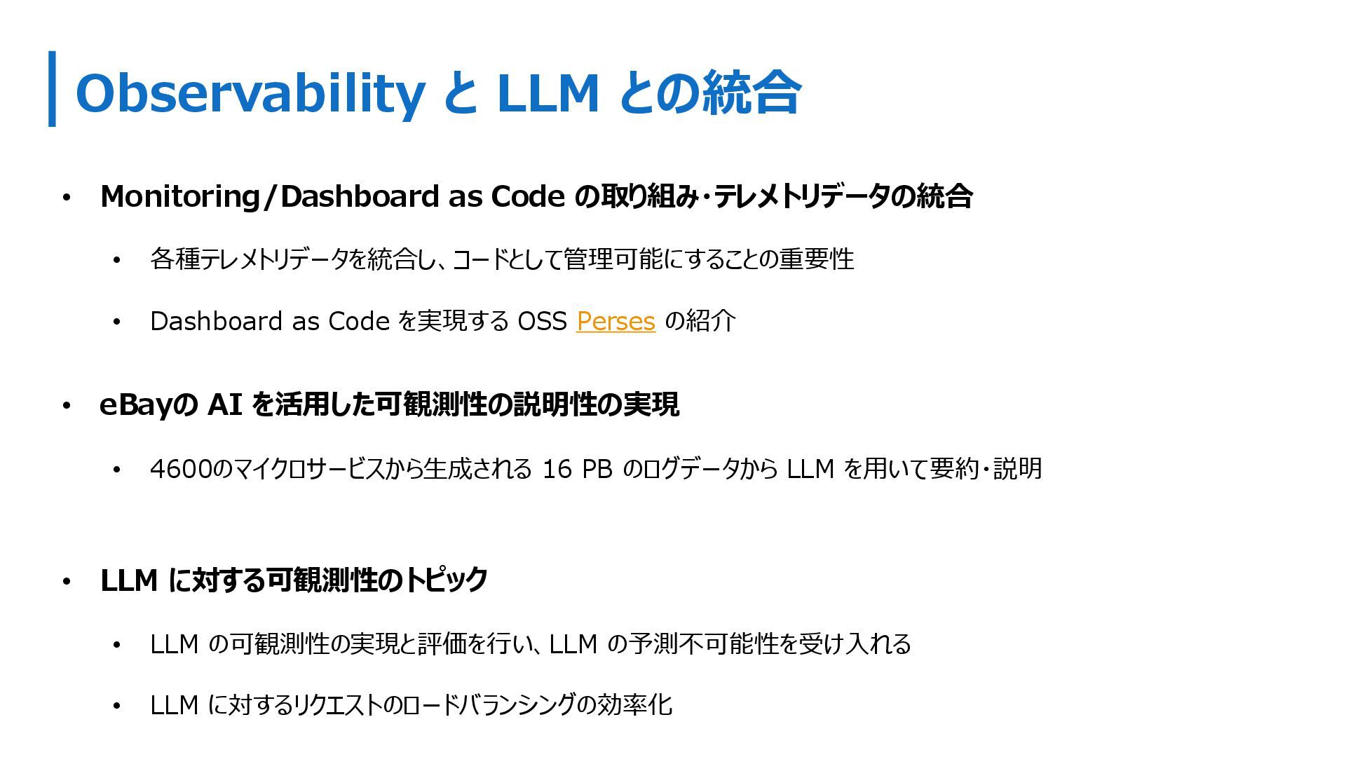 各種テレメトリデータを統合し、コードとして管理可能にすることの重要性 • Dashboard as Code を実現する OSS Perses の紹介 • eBayの AI を活用した可観測性の説明性の実現 • 4600のマイクロサービスから生成される 16 PB のログデータから LLM を用いて要約・説明 • LLM に対する可観測性のトピック • LLM の可観測性の実現と評価を行い、LLM の予測不可能性を受け入れる • LLM に対するリクエストのロードバランシングの効率化