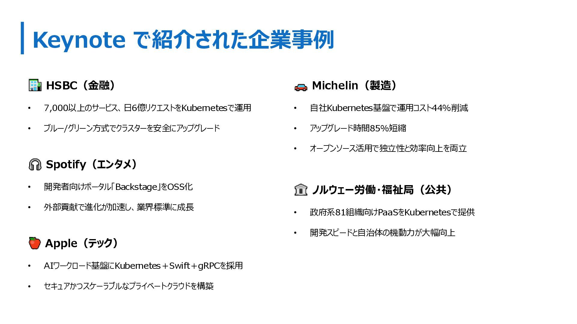 • 外部貢献で進化が加速し、業界標準に成長 Apple(テック) • AIワークロード基盤にKubernetes+Swift+gRPCを採用 • セキュアかつスケーラブルなプライベートクラウドを構築 Michelin(製造) • 自社Kubernetes基盤で運用コスト44%削減 • アップグレード時間85%短縮 • オープンソース活用で独立性と効率向上を両立 ノルウェー労働・福祉局(公共) • 政府系81組織向けPaaSをKubernetesで提供 • 開発スピードと自治体の機動力が大幅向上