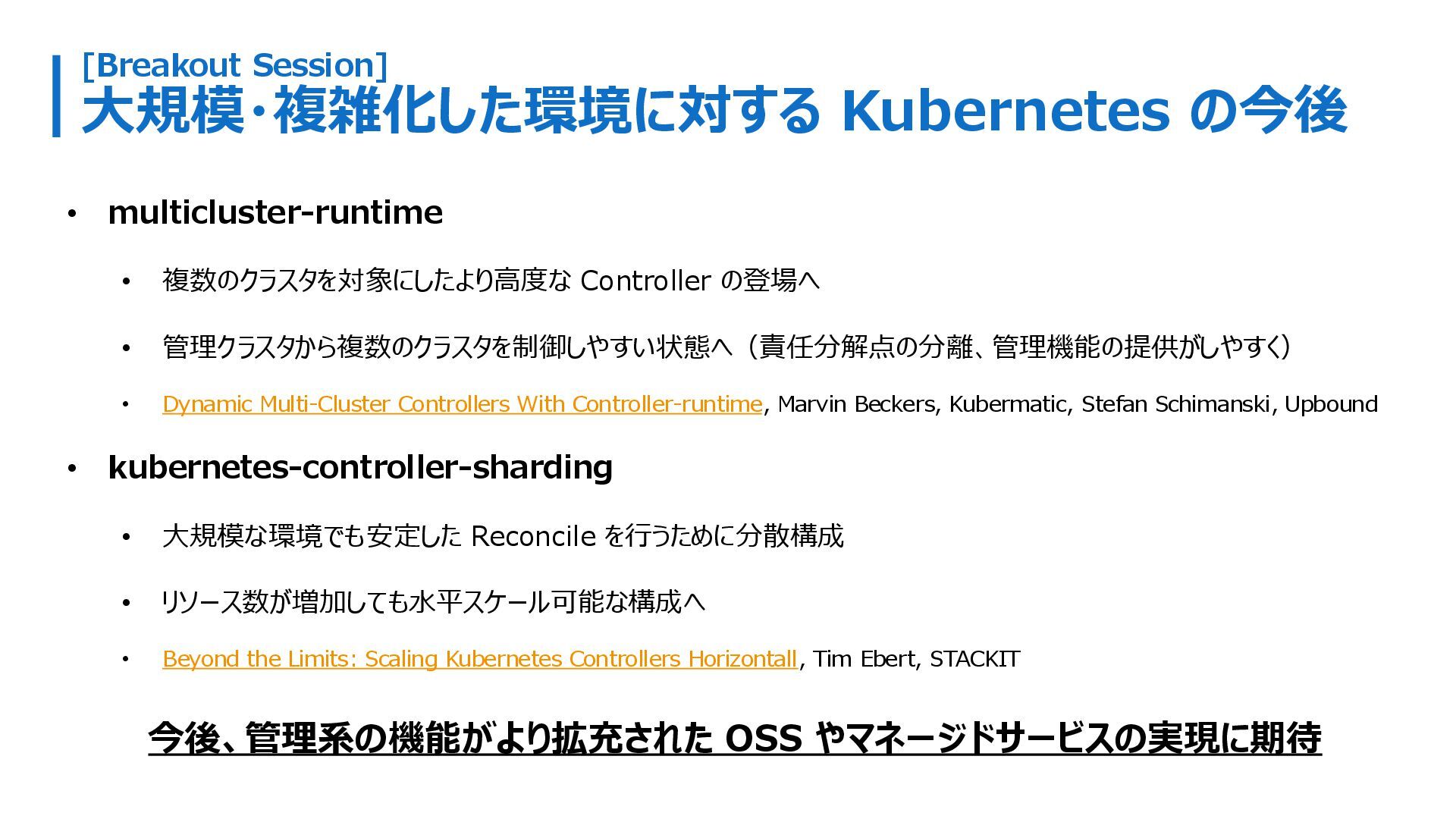 の登場へ • 管理クラスタから複数のクラスタを制御しやすい状態へ(責任分解点の分離、管理機能の提供がしやすく) • Dynamic Multi-Cluster Controllers With Controller-runtime, Marvin Beckers, Kubermatic, Stefan Schimanski, Upbound • kubernetes-controller-sharding • 大規模な環境でも安定した Reconcile を行うために分散構成 • リソース数が増加しても水平スケール可能な構成へ • Beyond the Limits: Scaling Kubernetes Controllers Horizontall, Tim Ebert, STACKIT 今後、管理系の機能がより拡充された OSS やマネージドサービスの実現に期待