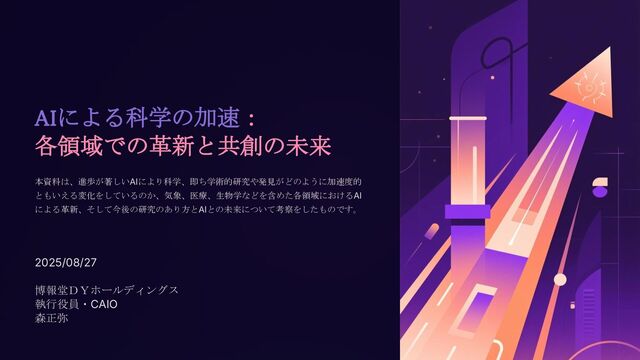 本資料は、進歩が著しいAIにより科学、すなわち学術的研究や発見がどのように加速度的ともいえる変化をしているのか、気象、医療、生物学などを含めた各領域におけるAIによる革新、そして今後の研究のあり方とAIとの未来について考察をしたものです。