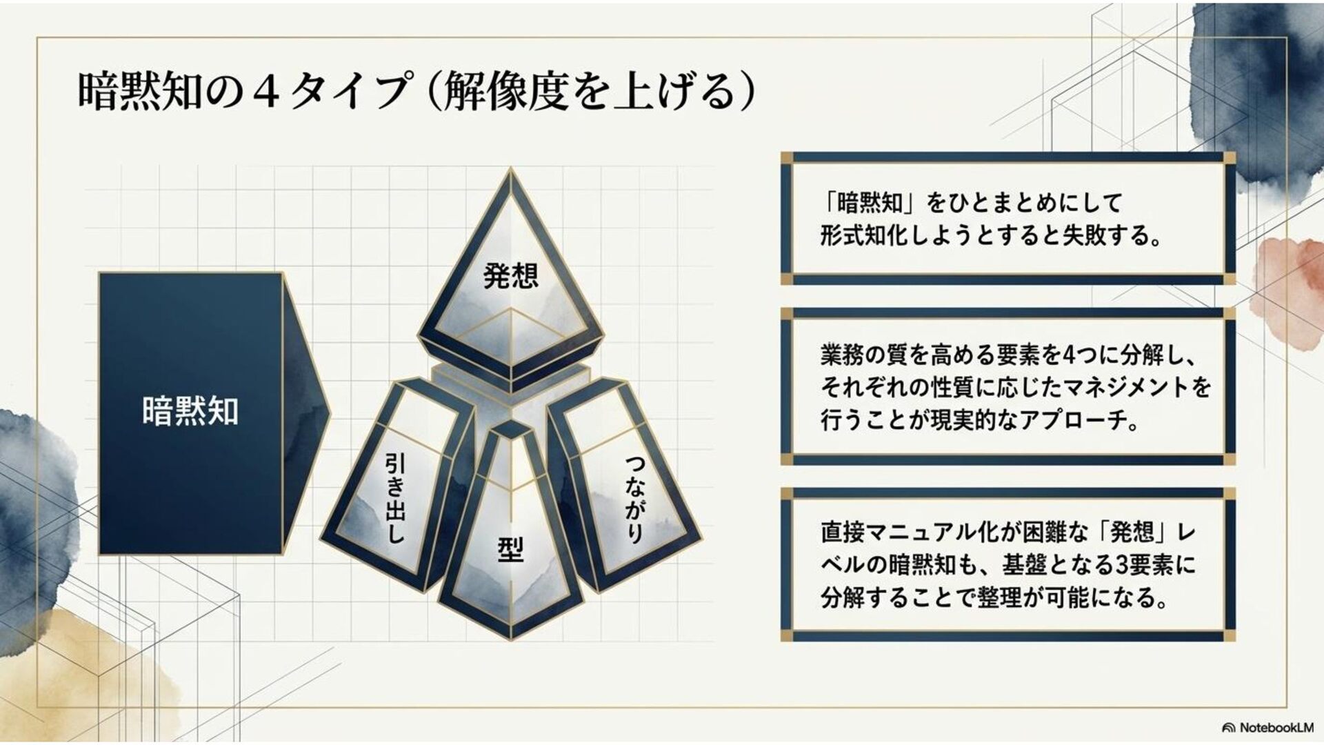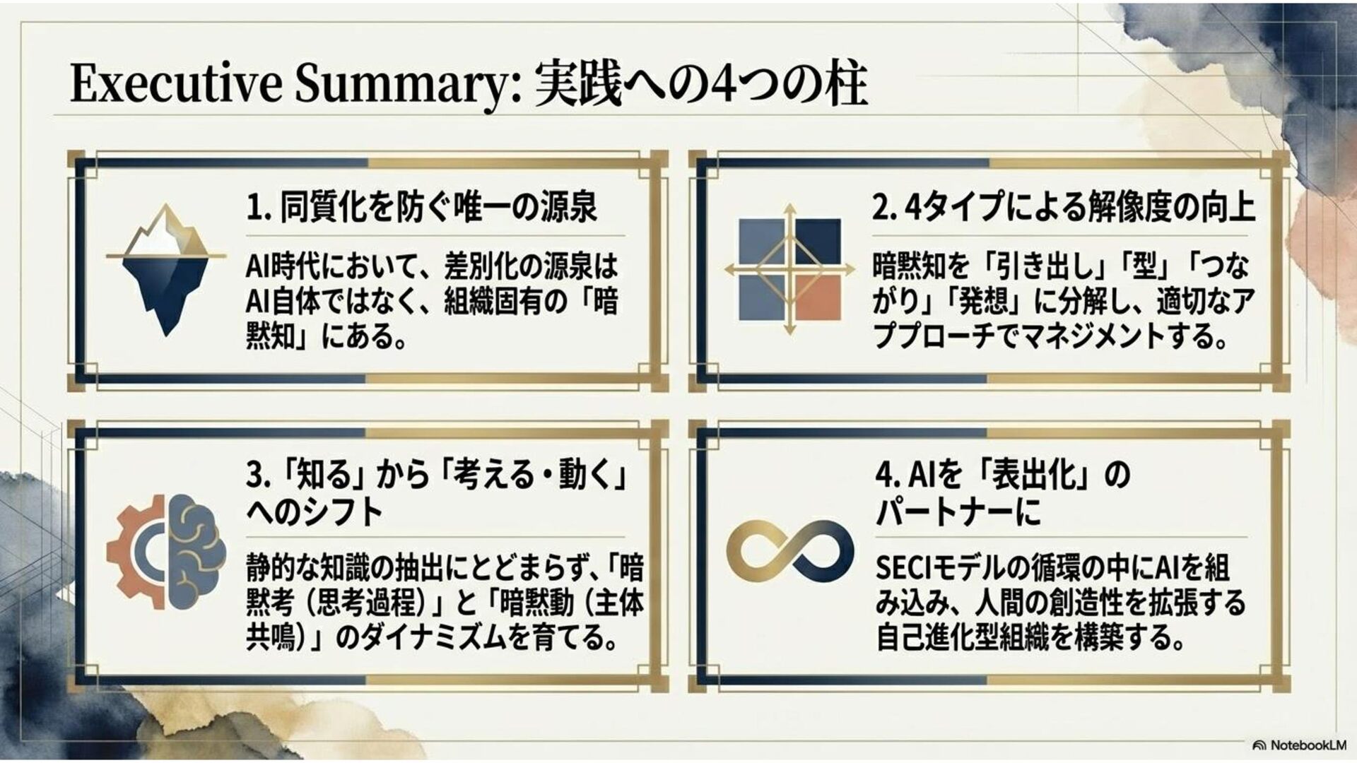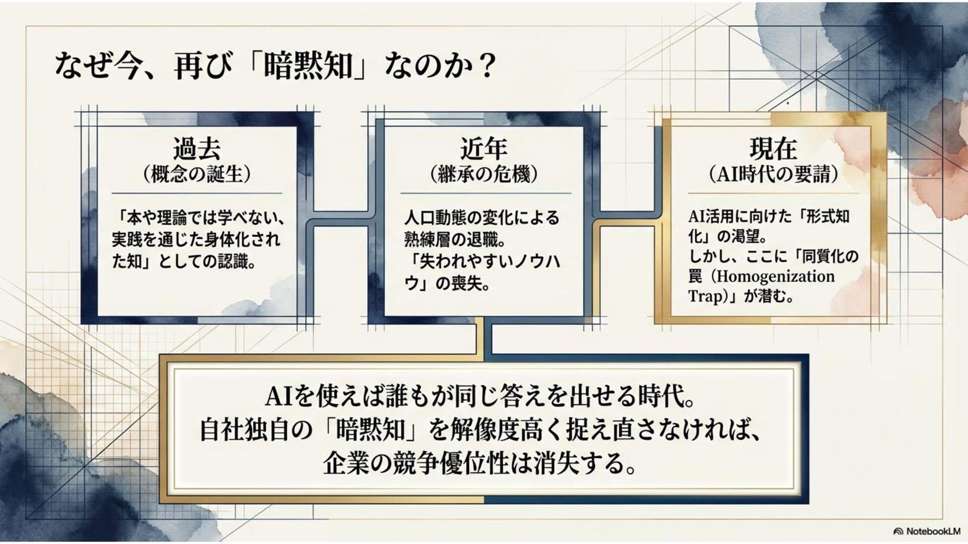 本ドキュメントは、AI時代だからこそ、企業・組織においてよく議論されるようになった「暗黙知」について、その解像度をあげるべく考察した内容になっています。