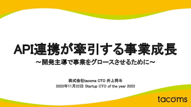 API連携が牽引する事業成長 〜開発主導で事業をグロースさせるために〜 株式会社tacoms CTO 井上将斗 2023年11月22日 Startup CTO of the