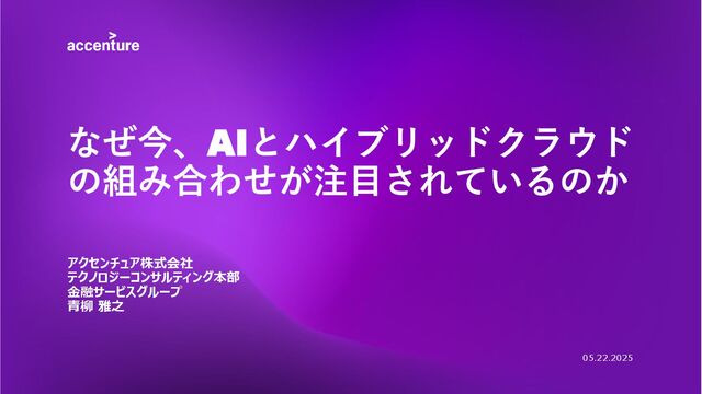 テクノロジーコンサルティング本部 金融サービスグループ プリンシパル・ディレクター 日本マイクロソフト株式会社、アマゾン ウェブ サービス ジャパン株式会 社を経て2017年にアクセンチュア株式会社に入社。金融サービスグル ープに所属。モダナイゼーションやAIの分野のコンサルティングやSIに従 事。 青柳 雅之(あおやぎ まさゆき) Google Cloud Partner Top Engineer Award 2021,2023 Google Cloud All Stars 2024 Jagu’e’r Award 最優秀賞 2021 AWS APN Partner Top Engineer 2019