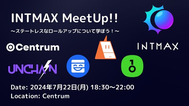 INTMAX MeetUp!! 〜ステートレスなロールアップについて学ぼう!〜 Date: 2024年7月22日(月) 18:30〜22:00 Location: Centrum