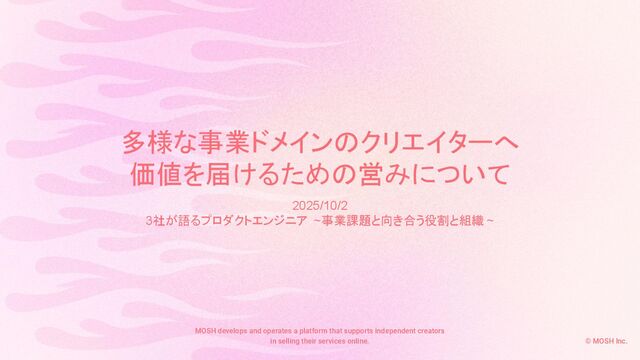 多様な事業ドメインのクリエイターへ 価値を届けるための営みについて 2025/10/2 3社が語るプロダクトエンジニア ~事業課題と向き合う役割と組織 ~ © MOSH Inc. MOSH