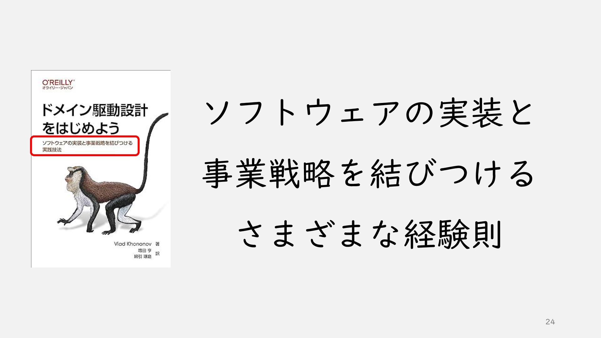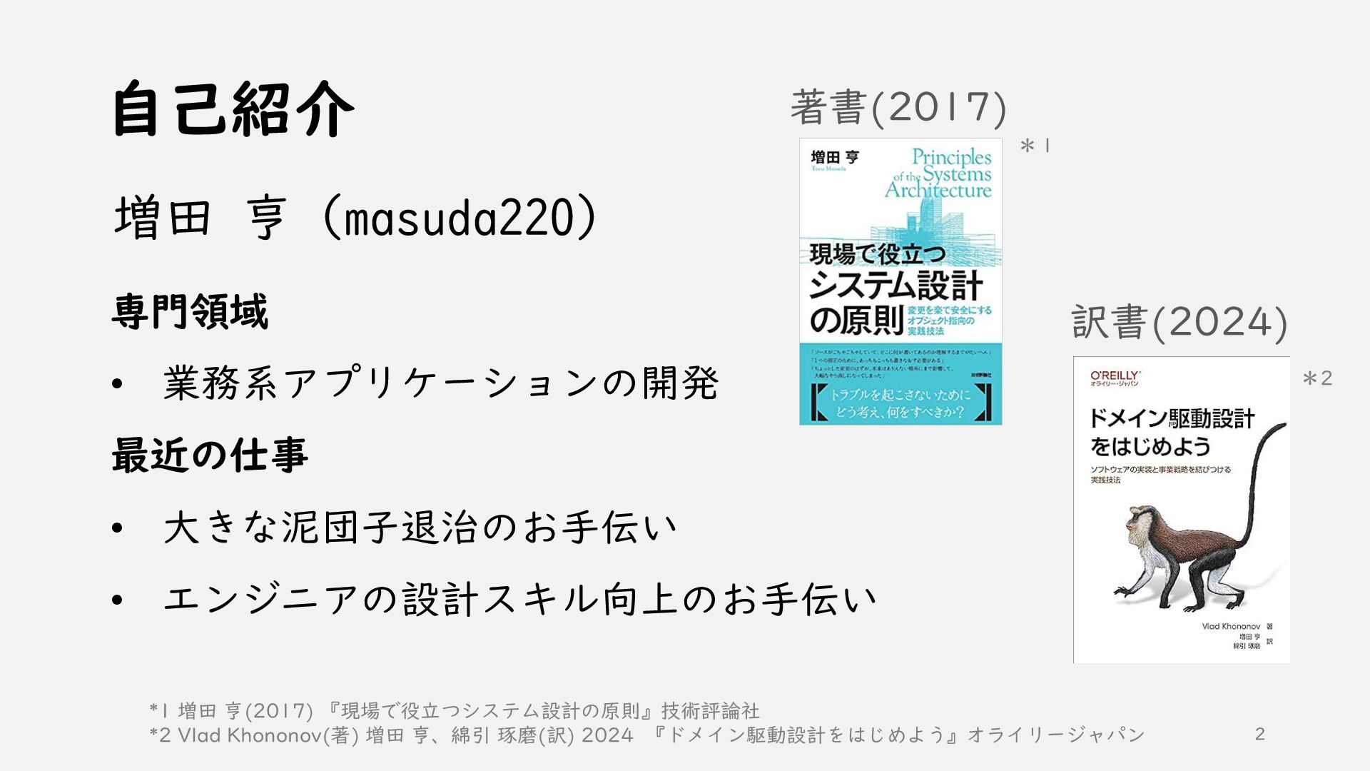 増田 亨(masuda220) 著書(2017) 訳書(2024) *1 *2 *1 増田 亨(2017) 『現場で役立つシステム設計の原則』技術評論社 *2 Vlad Khononov(著) 増田 亨、綿引 琢磨(訳) 2024 『ドメイン駆動設計をはじめよう』オライリージャパン