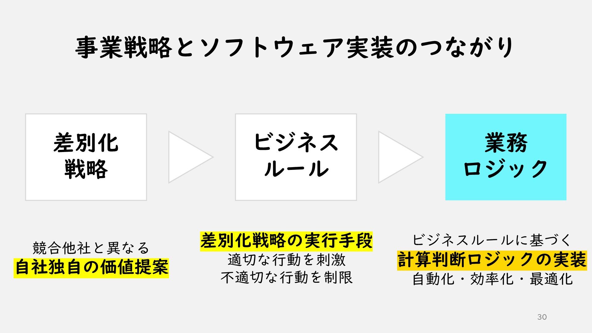 4. 事業戦略とソフトウェア実装のつながり 30 差別化 戦略 競合他社と異なる 自社独自の価値提案 ビジネス ルール 差別化戦略の実行手段 適切な行動を刺激