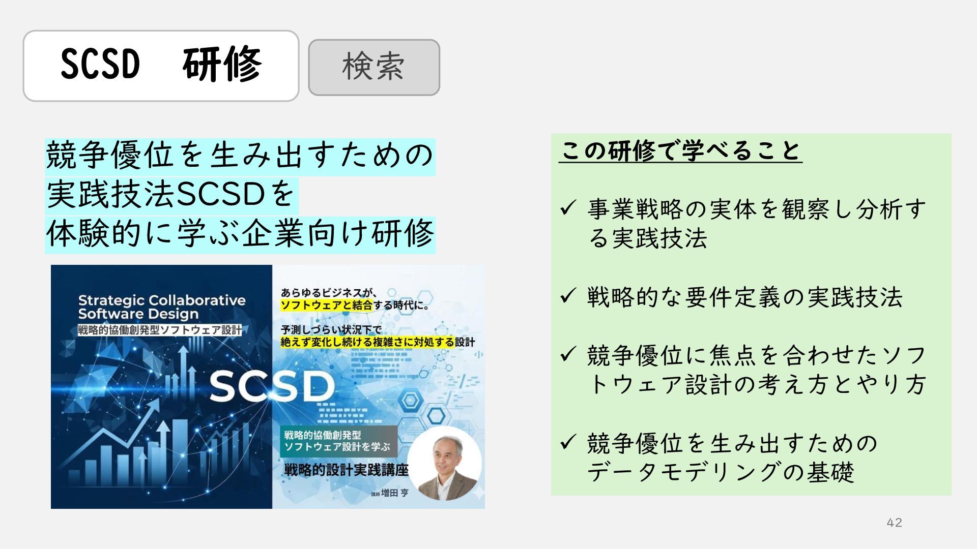 6. 42 SCSD 研修 検索 競争優位を生み出すための 実践技法SCSDを 体験的に学ぶ企業向け研修 この研修で学べること ✓ 事業戦略の実体を観察し分析す