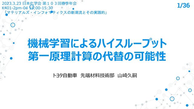 機械学習によるハイスループット 第一原理計算の代替の可能性 1/36 2023.3.23 日本化学会 第103回春季年会 K401-2pm-04 15:00-15:30 「マテリアルズ・インフォマティクスの新潮流とその実践的」 トヨタ自動車