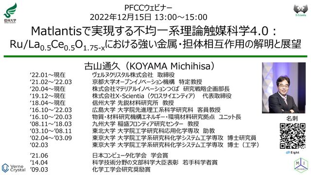 本ウェビナーでは、Matlantisを用いることでサイバーとフィジカルの融合を実現することで複雑な担持金属触媒上における活性起源を解明した事例を紹介するとともに、理論触媒科学の刷新に向けた展望について紹介する。