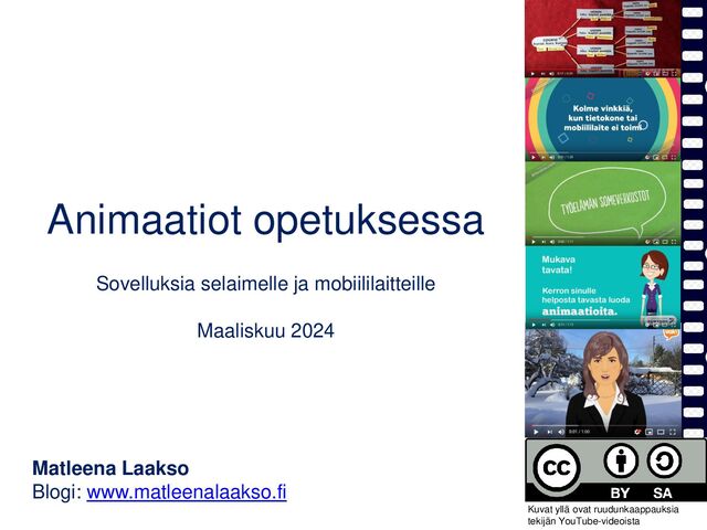 Diasarja esittelee ainakin opetuskäytössä maksuttomia animaatiosovelluksia. Lisää päivittyviä ohjeita mm. erilaisten videoiden tekemiseen ja opetuskäyttöön sekä jakamiseen YouTubeen ja tekstittämiseen löydät blogini ohjeiden sivulta: https://www.matleenalaakso.fi/p/koulutusdiat.html