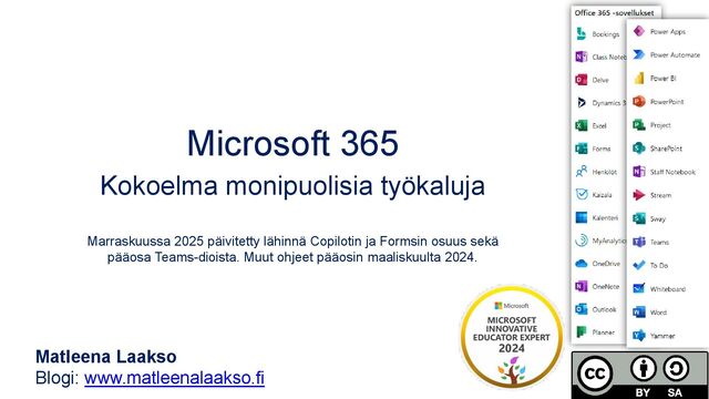 Microsoftin pilvipalvelun sovellusten esittelyä ensisijassa opettajien ja muunkin oppilaitoksen toiminnan näkökulmasta. Parhaiten pysyt ajantasalla jatkuvissa muutoksissa seuraamalla Facebook-ryhmää: https://www.facebook.com/groups/o365.opetuksessa.ja.oppimisessa