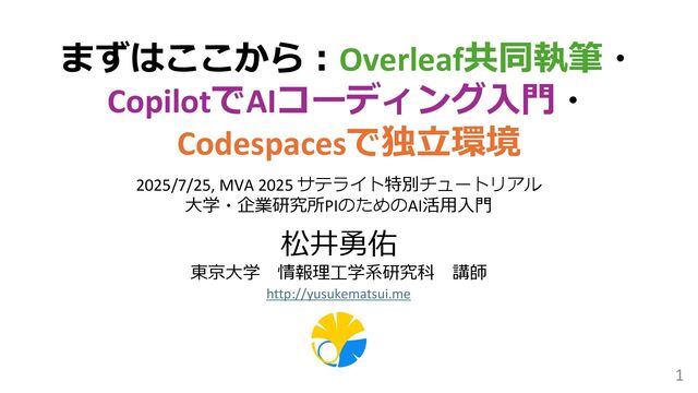 MVA 2025 サテライト特別チュートリアル:大学・企業研究所PIのためのAI活用入門 2025/7/25 @京都大学 学術情報メディアセンター 南館(オンサイト開催&オンライン配信) https://sites.google.com/view/mva2025-ai-tutorial/home