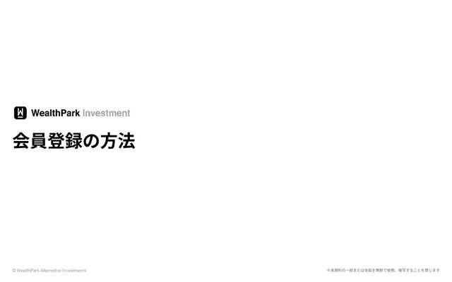 1. © WealthPark Alternative Investments はじめに - 投資家登録と⼝座開設 投資家登録は、投資⽤⼝座を開設し、弊社サービスにおける投資家会員として登録するための⼿続きです。 登録は、個⼈名義だけでなく、法⼈名義でも⾏うことが可能です。 投資家登録には、必要書類の提出と、登録された⽅がご本⼈であることを確認する本⼈確認が必要です。