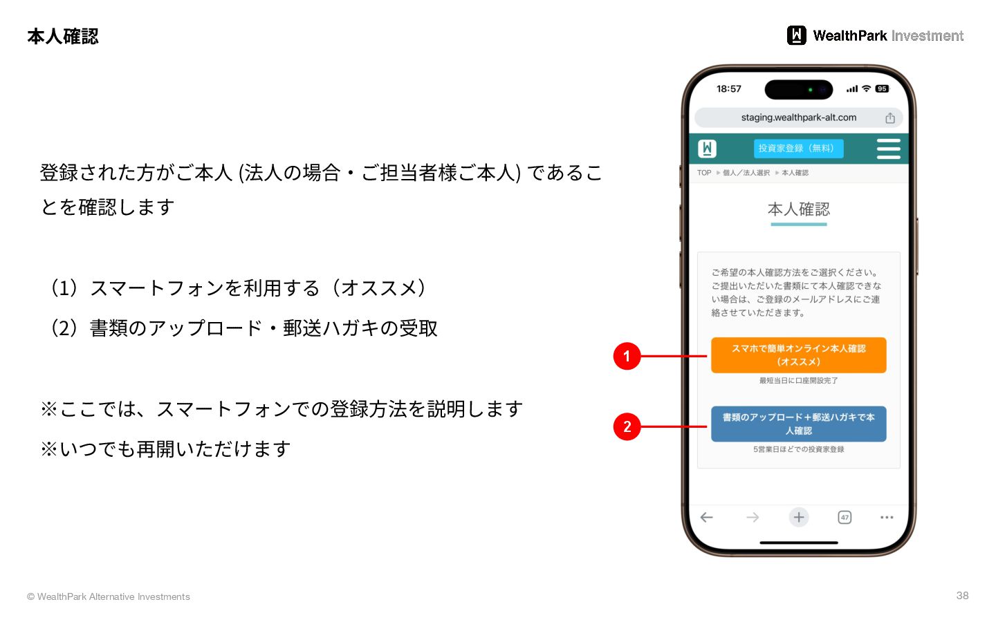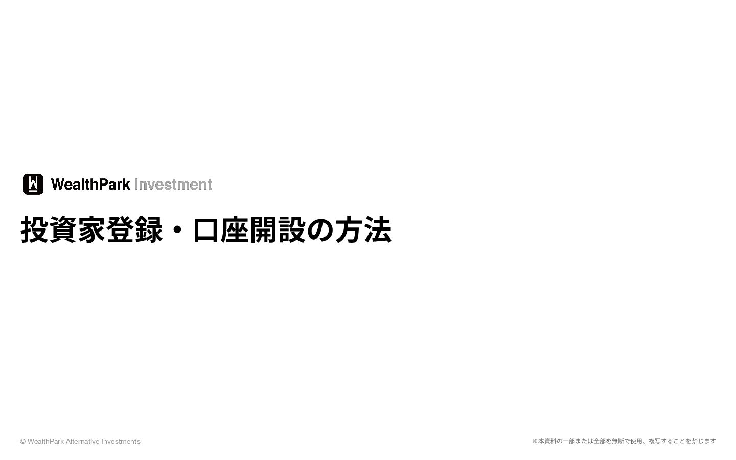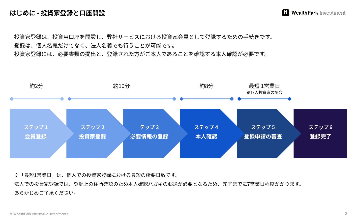 1. © WealthPark Alternative Investments はじめに - 投資家登録と⼝座開設 投資家登録は、投資⽤⼝座を開設し、弊社サービスにおける投資家会員として登録するための⼿続きです。 登録は、個⼈名義だけでなく、法⼈名義でも⾏うことが可能です。 投資家登録には、必要書類の提出と、登録された⽅がご本⼈であることを確認する本⼈確認が必要です。