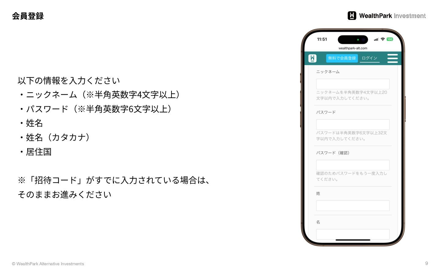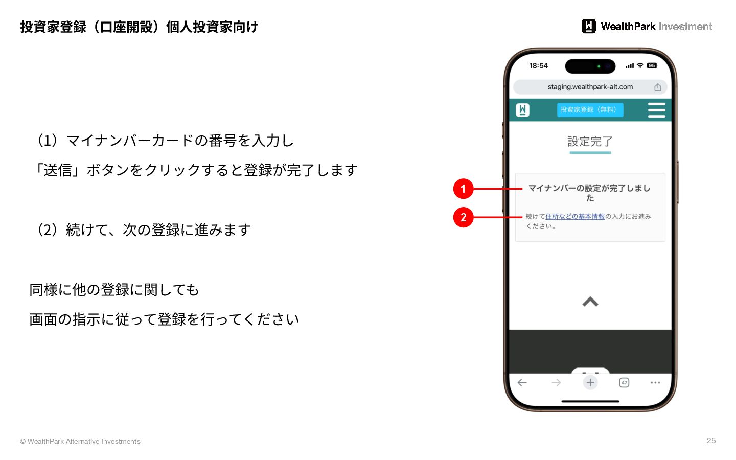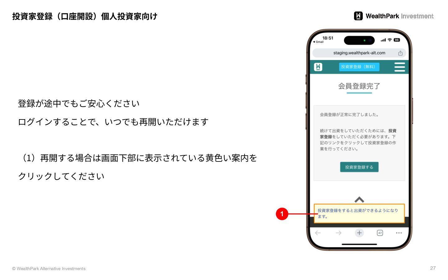 1. © WealthPark Alternative Investments はじめに - 投資家登録と⼝座開設 投資家登録は、投資⽤⼝座を開設し、弊社サービスにおける投資家会員として登録するための⼿続きです。 登録は、個⼈名義だけでなく、法⼈名義でも⾏うことが可能です。 投資家登録には、必要書類の提出と、登録された⽅がご本⼈であることを確認する本⼈確認が必要です。